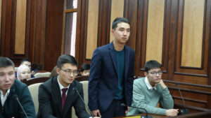 Программанын алкагында Конституциялык соттун төрагасынын орун басары Дүйшеев Карыбек Арстанбекович менен жолугушуу болду. Диалогдун жүрүшүндө юристтин кесиптик даярдыгы, сот системасында иштөөгө коюлуучу талаптар жана судья менен юристтин Конституция алдындагы жоопкерчилиги талкууланды.